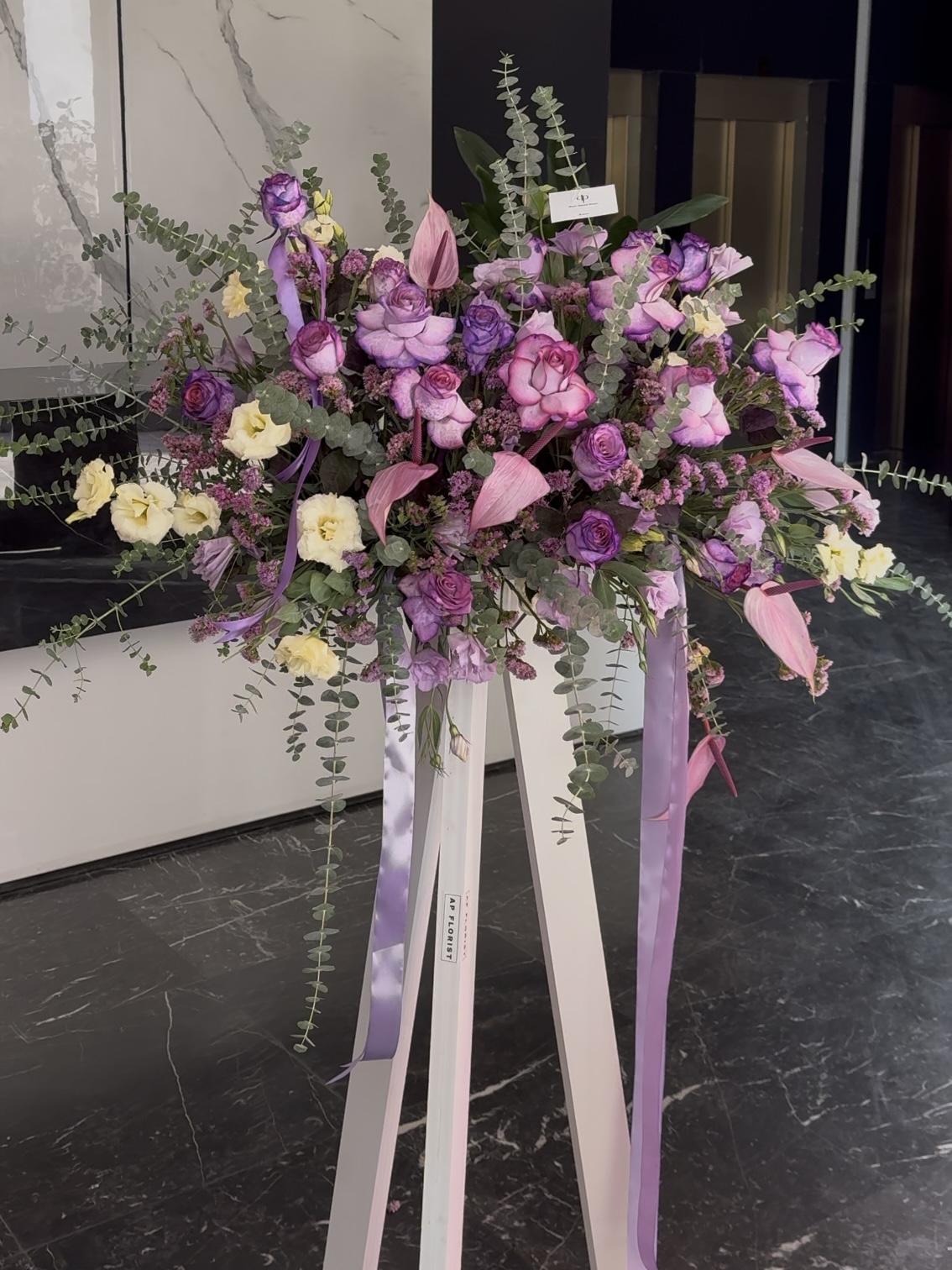 پایـه گُل وحــش ؛ ترکیبی از گلـهای بنفش “ رز هلندی، آنتریوم، لیسینتوس، زنبوری و برگ اکالیپتوس” که تو رنـگبندی دلخواهتون قابل اجراسـت. قابل ارسال در ســاری و اطــراف.