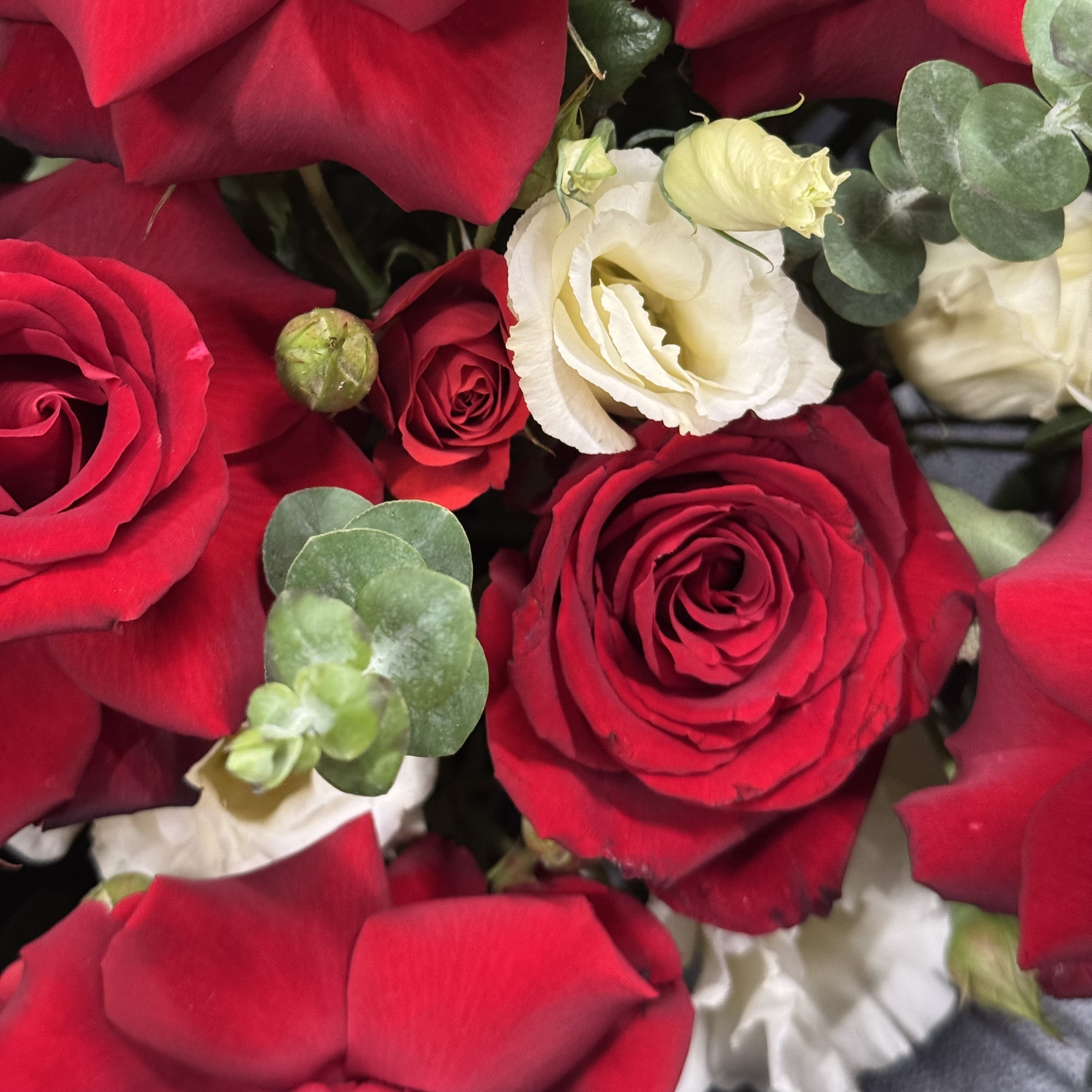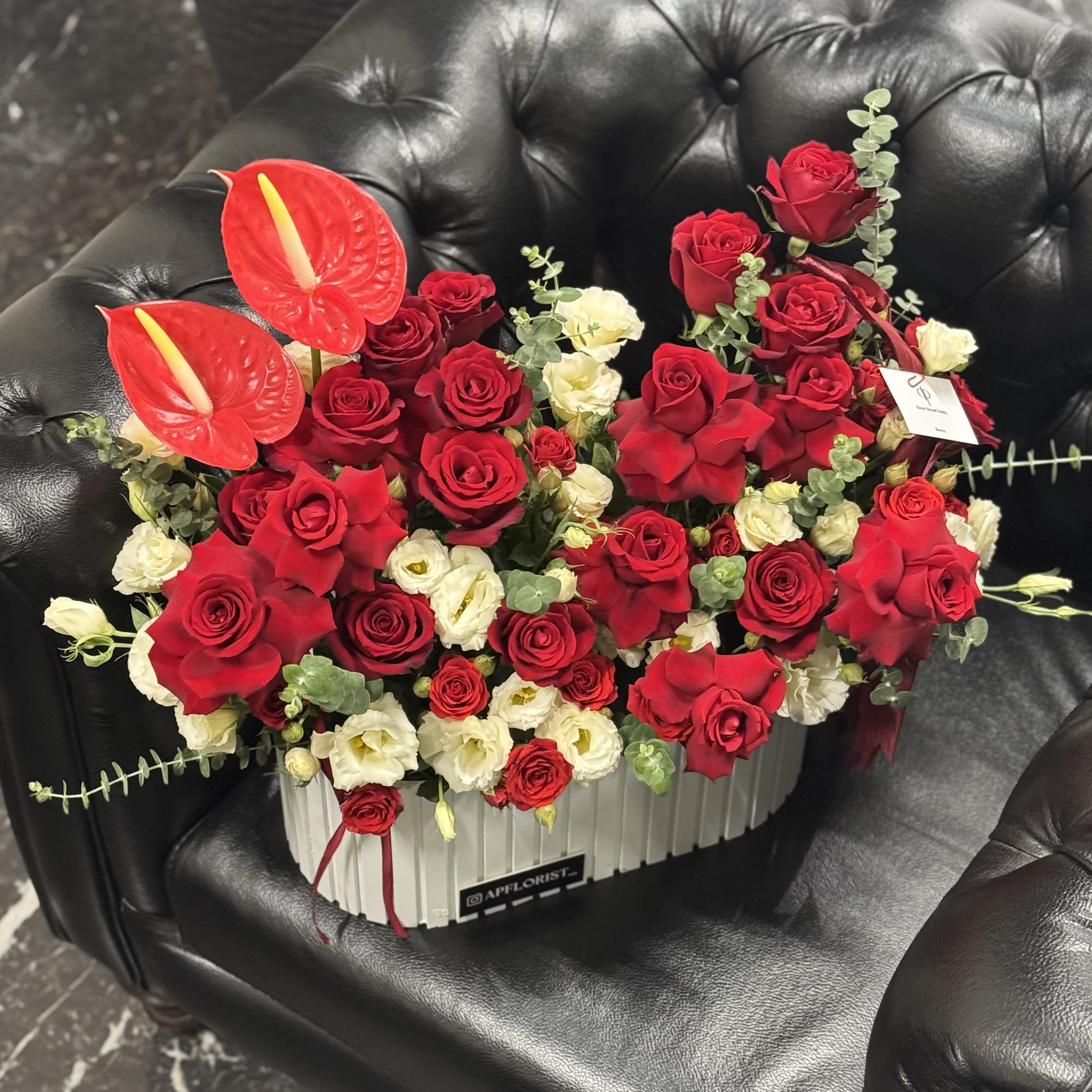 باکس گل لاولی ؛ ترکـیبی شیک و درخشان از گلهای “ رز هلندی قرمز، مینیاتوری، لیسین، آنتریوم و برگ اکالیپتوس. برای موندگاری بیشتر گلها کافیه ؛ ۱- در فضای خنک نگهداری شود. ۲- اب گلها روزانه عوض شود. ۳- ساقهی گلها روزانه کوتاه شود.