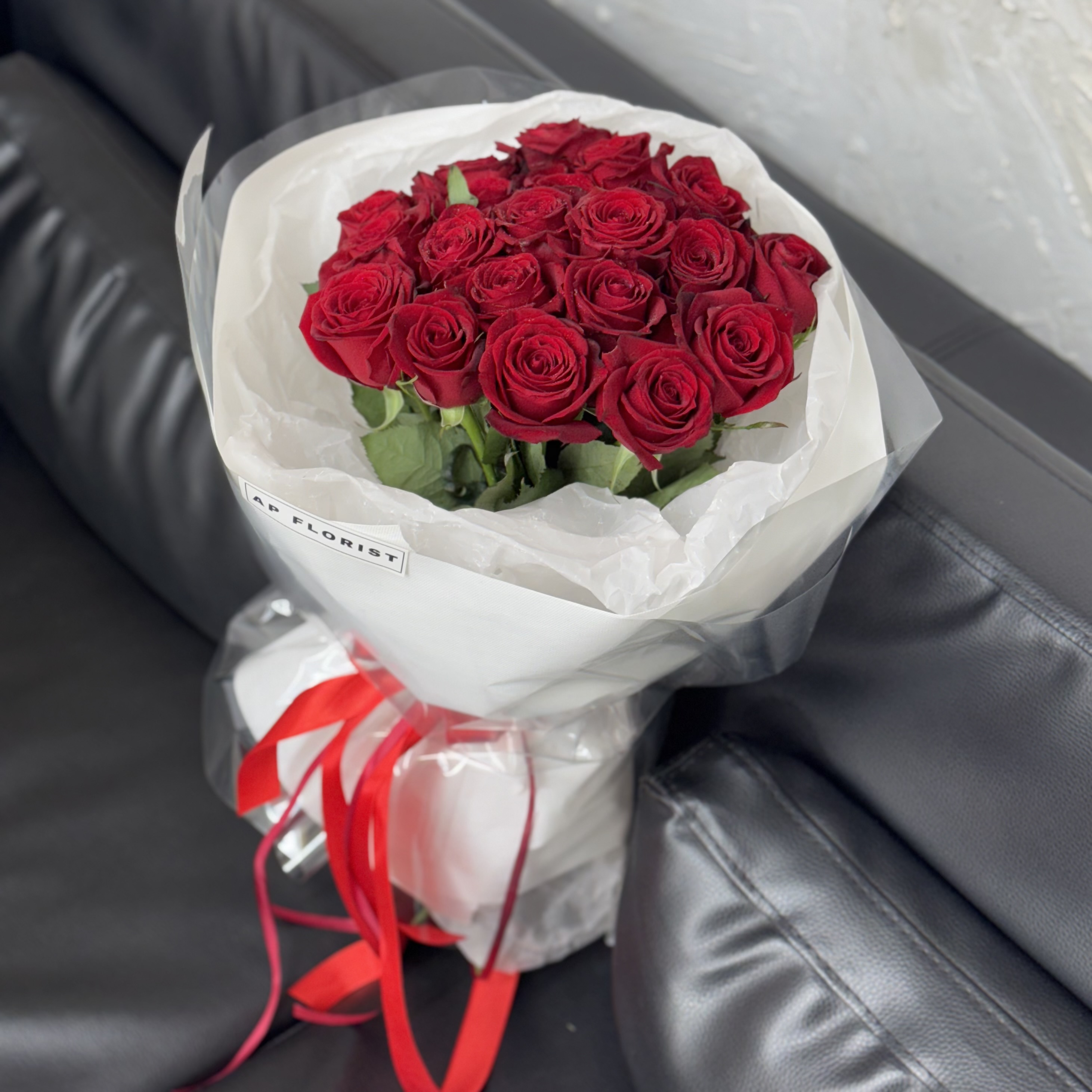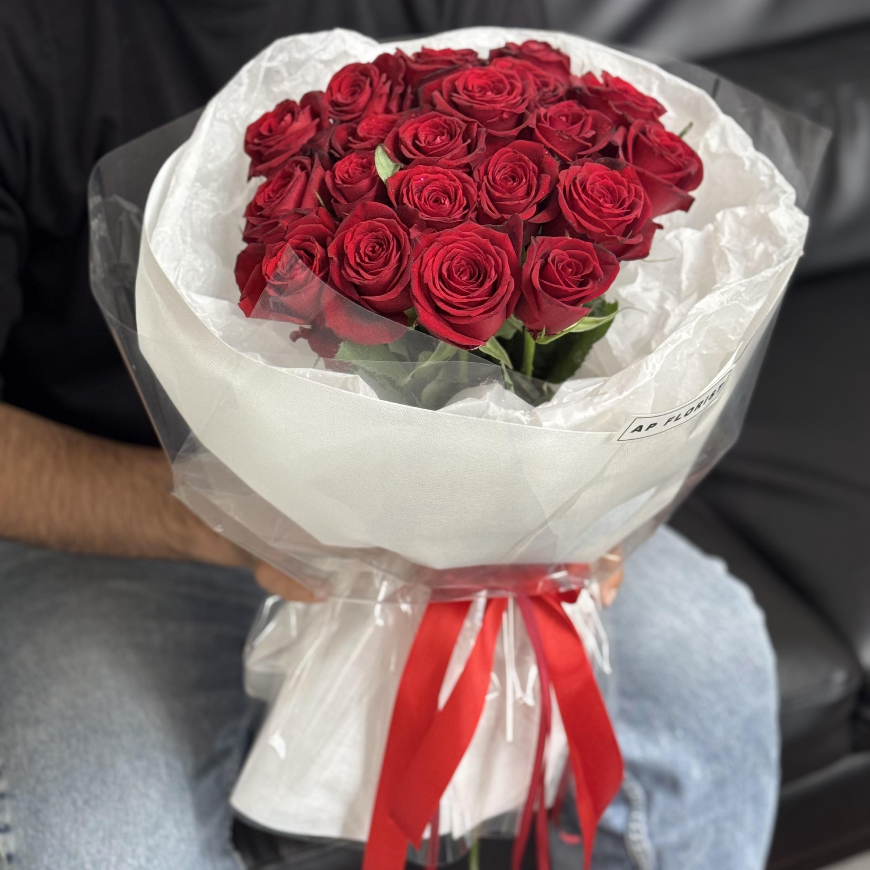 دستهگل اریانا ؛ ترکیبی از بیست شاخه رز هلندی قرمز که با سبک دیزاین مینیمال که تو رنگبندی قابل اجراست. برای موندگاری بیشتر گلها کافیه ؛ ۱- در فضای خنک نگهداری شود. ۲- اب گلها روزانه عوض شود. ۳- ساقهی گلها روزانه کوتاه شود.