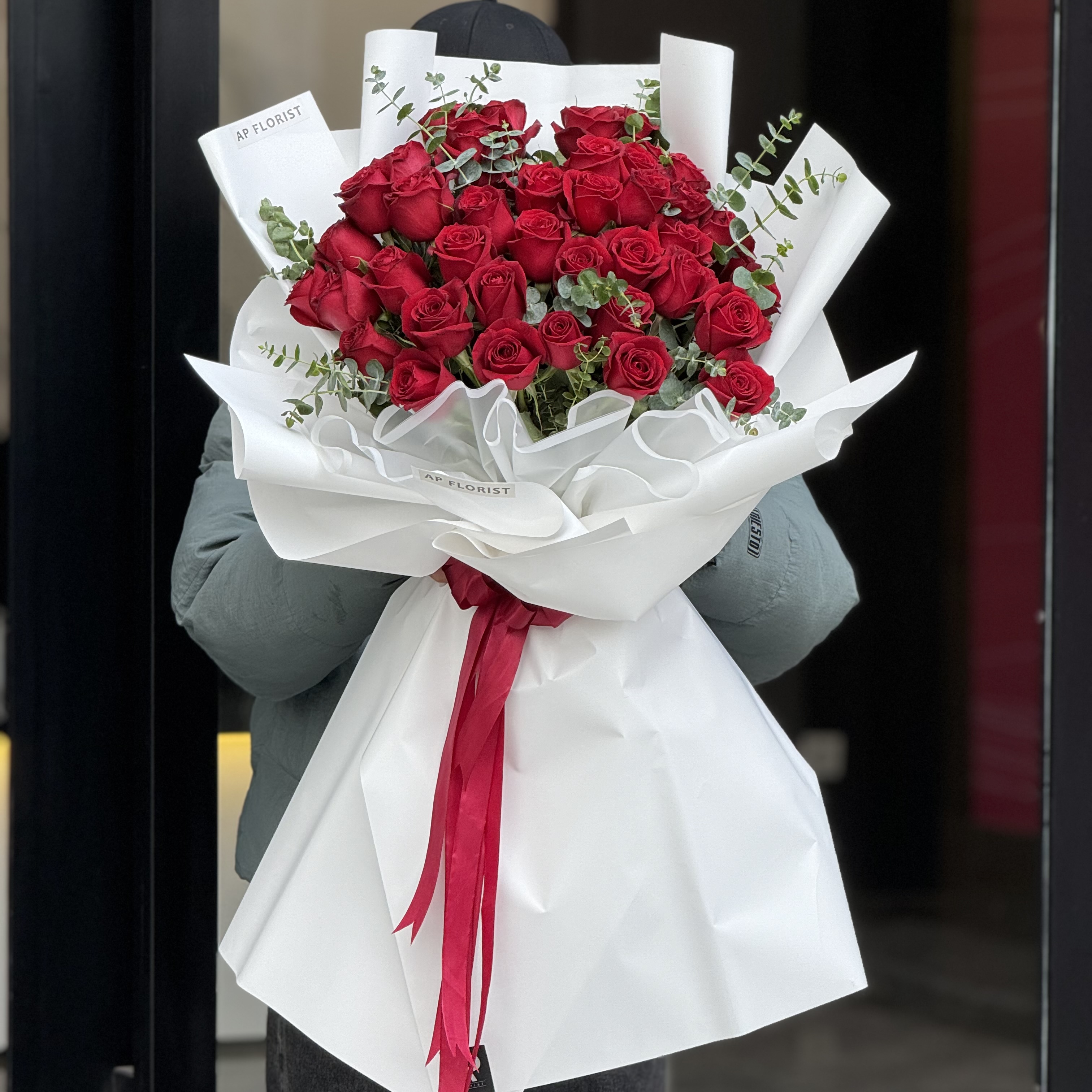 دستهگل آویلان ؛ ترکیبی لوکـس و پر حجم از چهل شاخه رز هلندی قرمز و برگ اکالیپتوس که تو رنگبندی دلخواهتون قابل ثبت و سفارشه! برای موندگاری بیشتر گلها کافیه ؛ ۱- در فضای خنک نگهداری کنین. ۲- ساقهی گلهارو روزانه یک سانت کوتاه کنین. ۳- آب گلهارو روزانه عوض کینن.