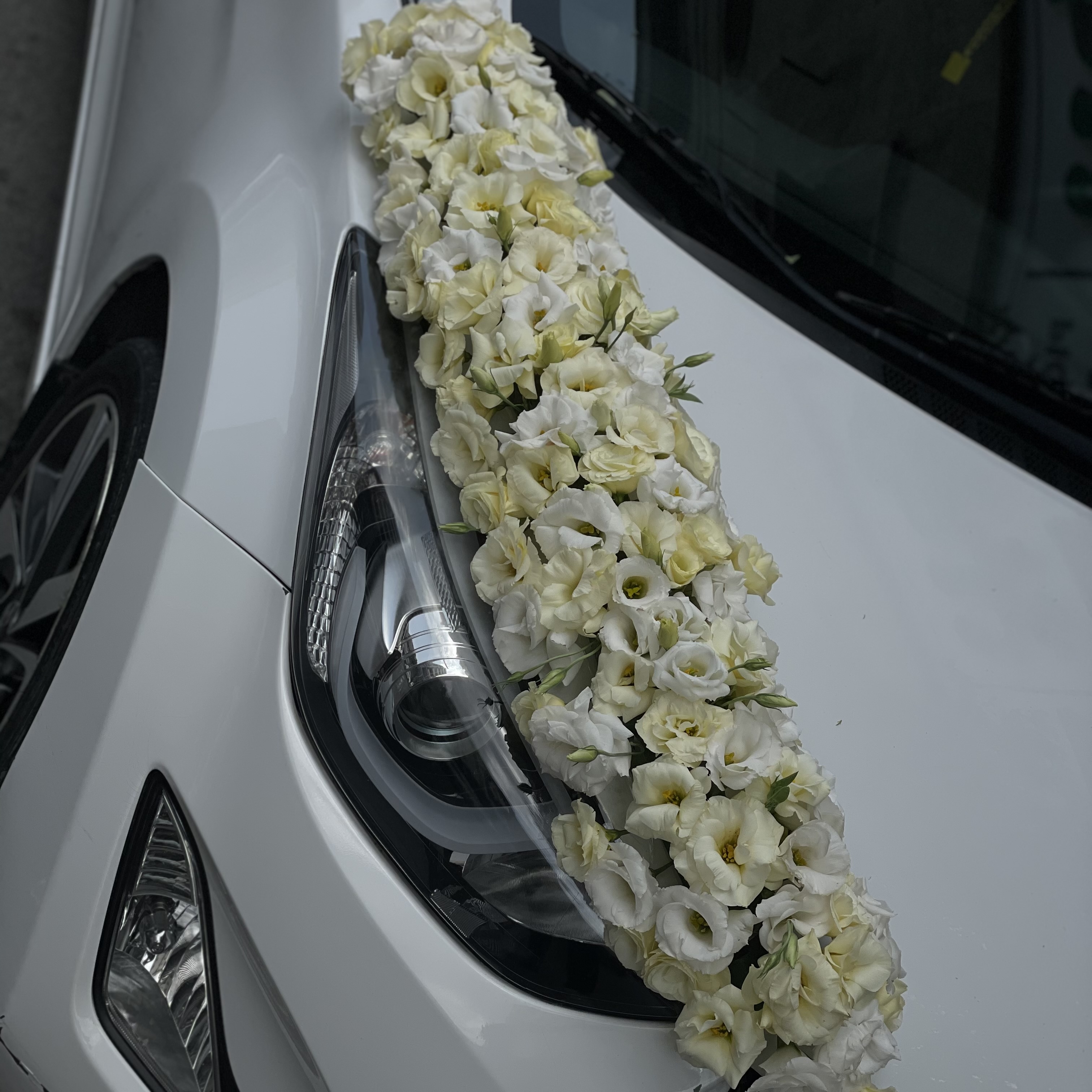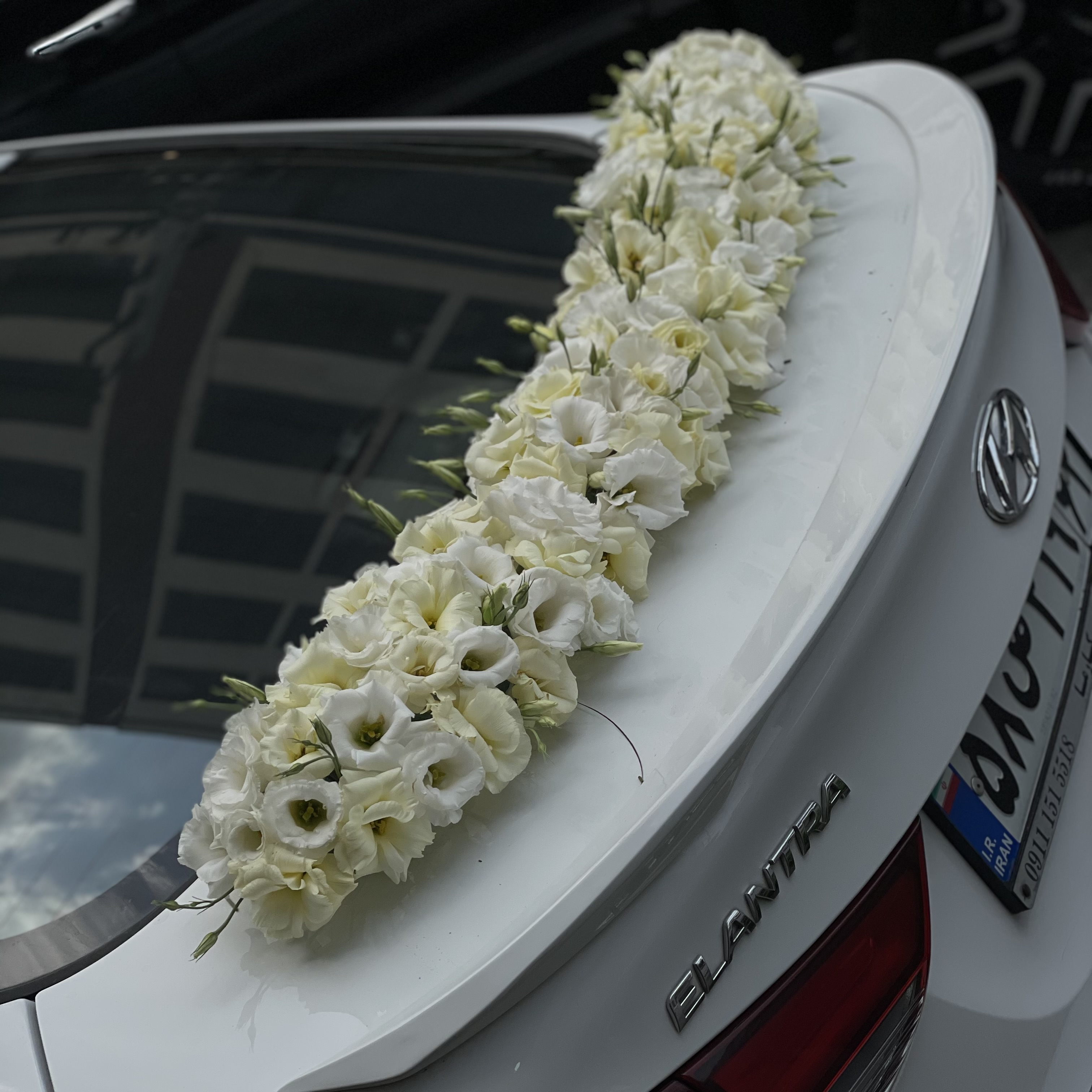 ماشین عروس الـویا ؛ ترکــیبی ساده و شیک از گلهای لیسینتوس سفید و نباتی که در دو قسمت جلو و عقب ماشین دیزاین شده و قابلیت تغییر رنگ برای شما عزیزان فراهم است.