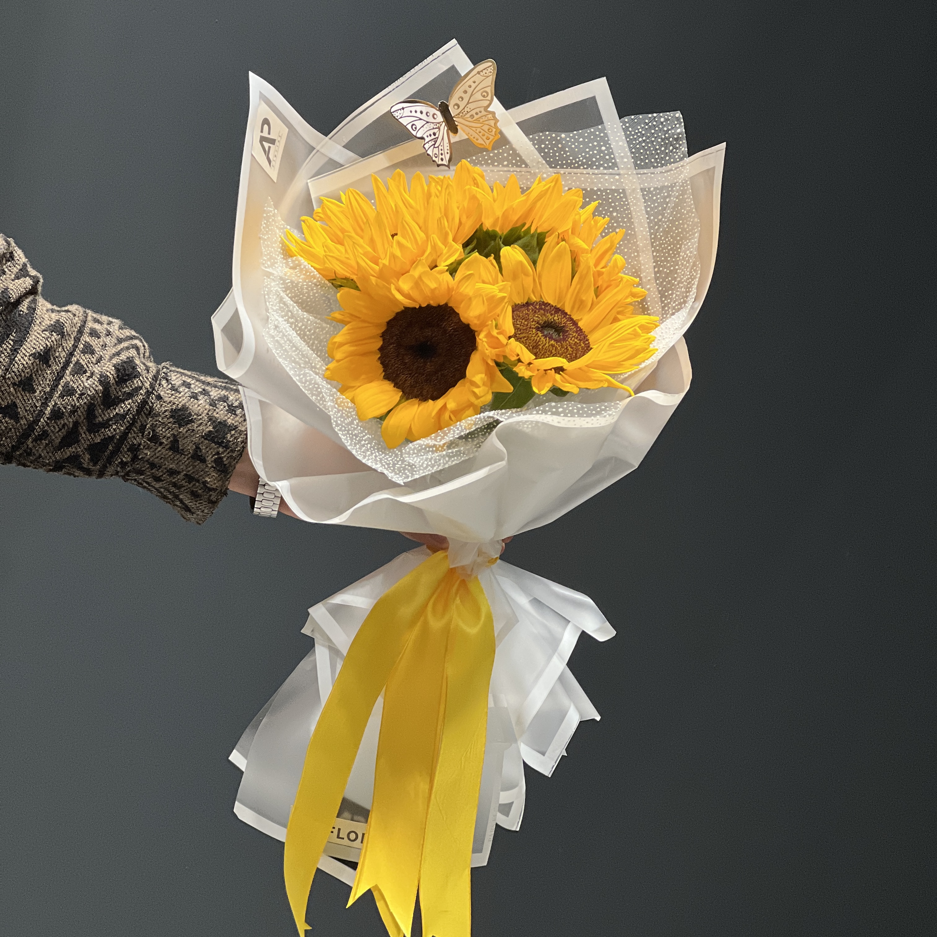 دستـهگل الـین ؛ ترکــیبی از پنج شــاخه آفتاب گردان با کاوری سفید.برای موندگاری بیشتر گلها کافیه ؛ ۱- در فضای خنک نگهداری شود. ۲- اب گلها روزانه عوض شود. ۳- ساقهی گلها روزانه کوتاه شود.