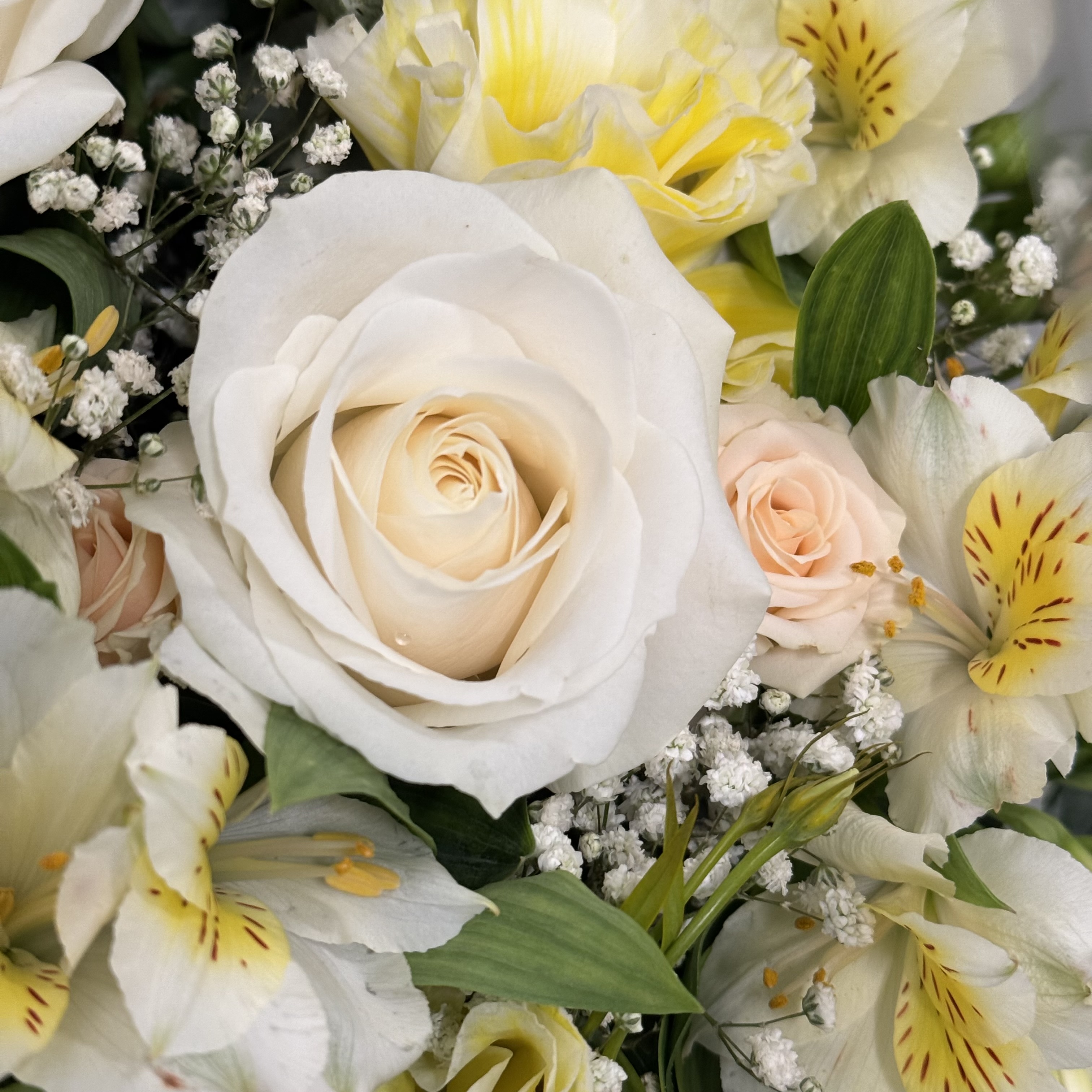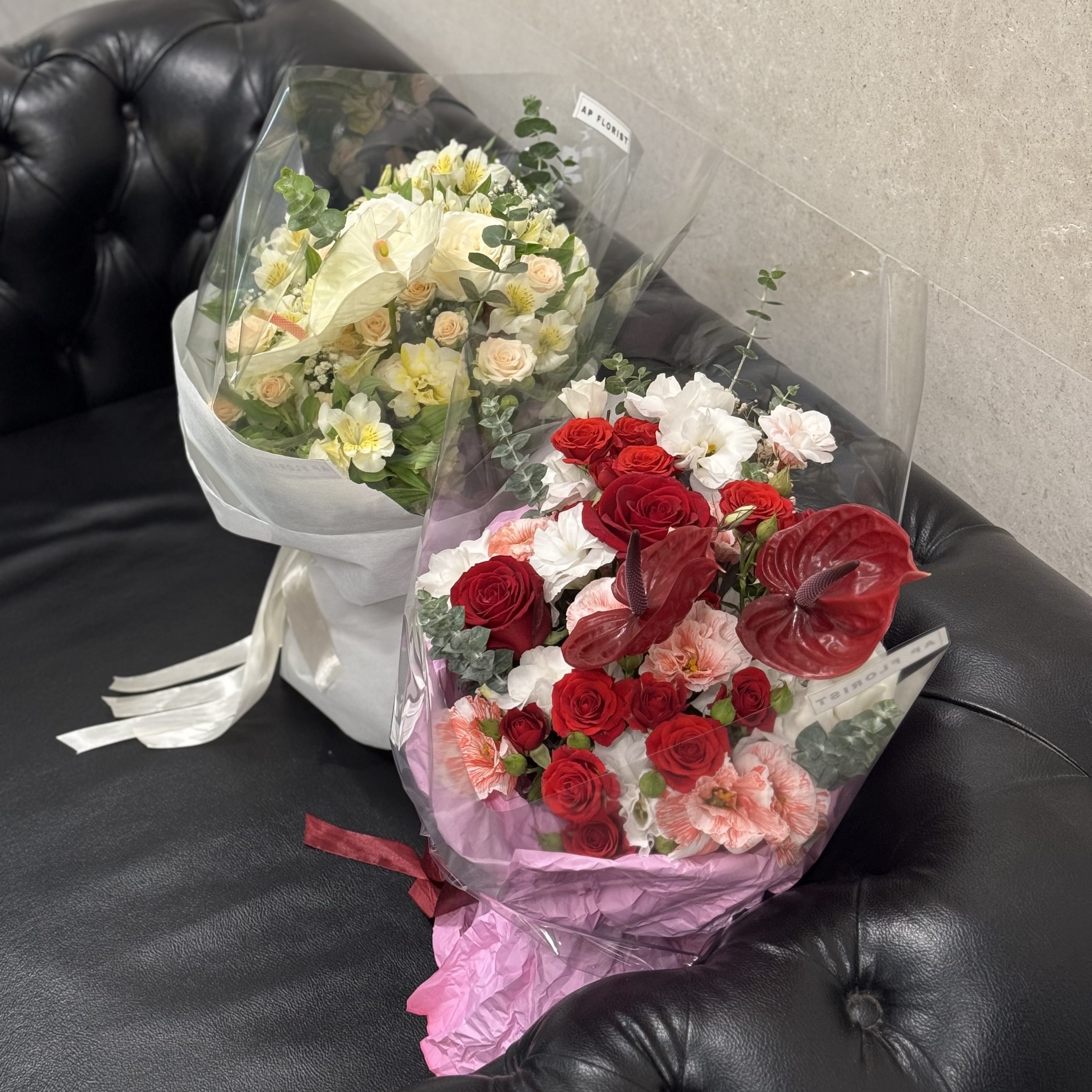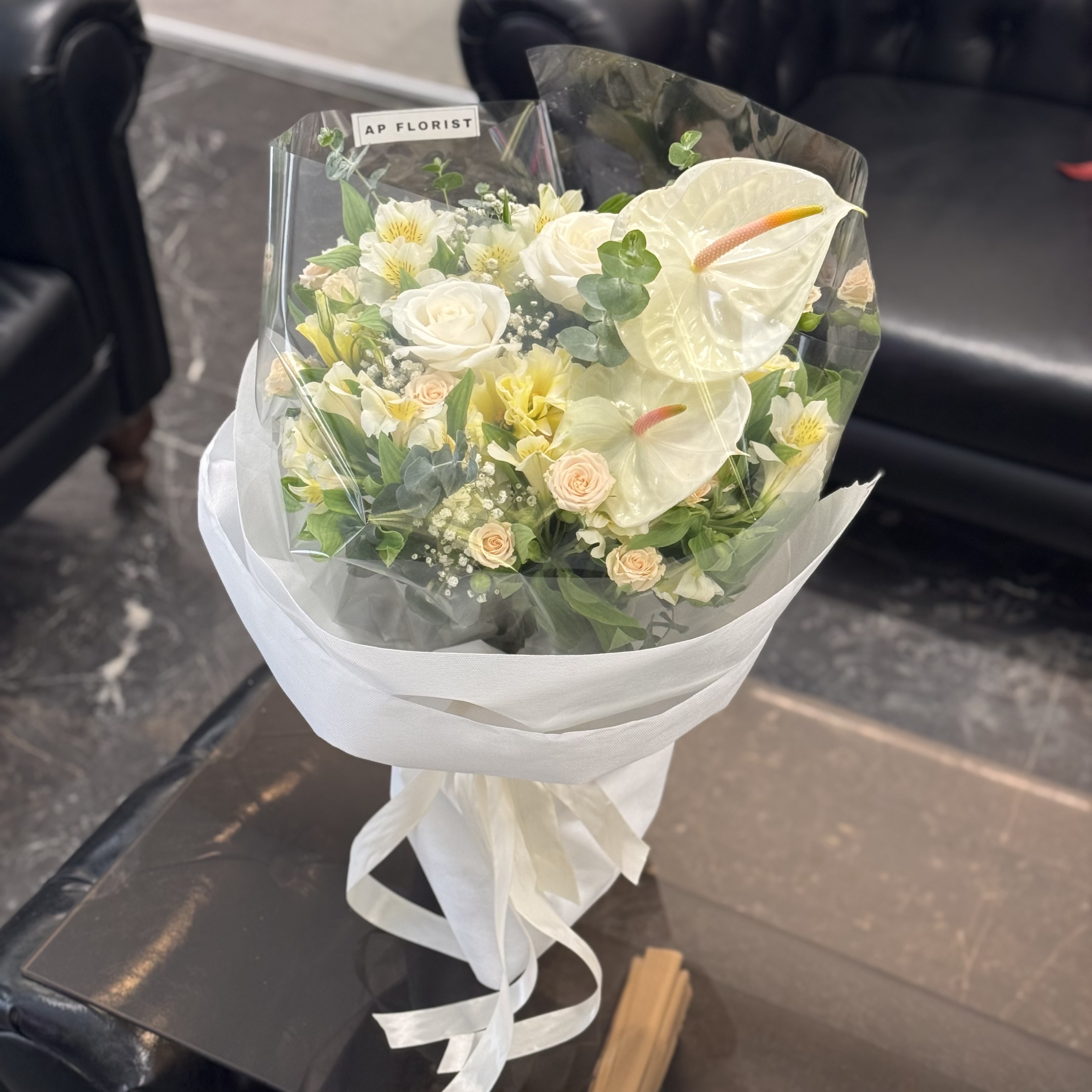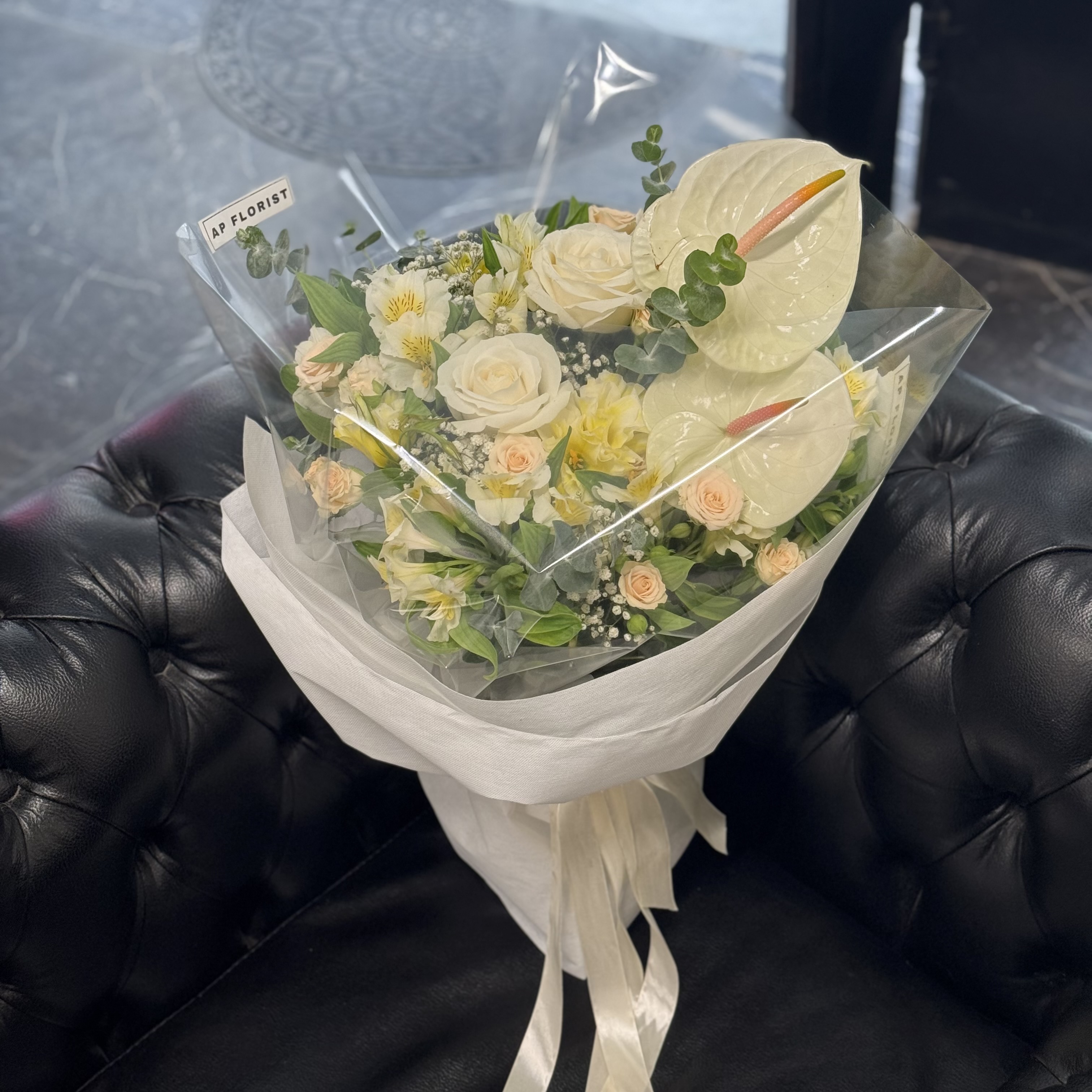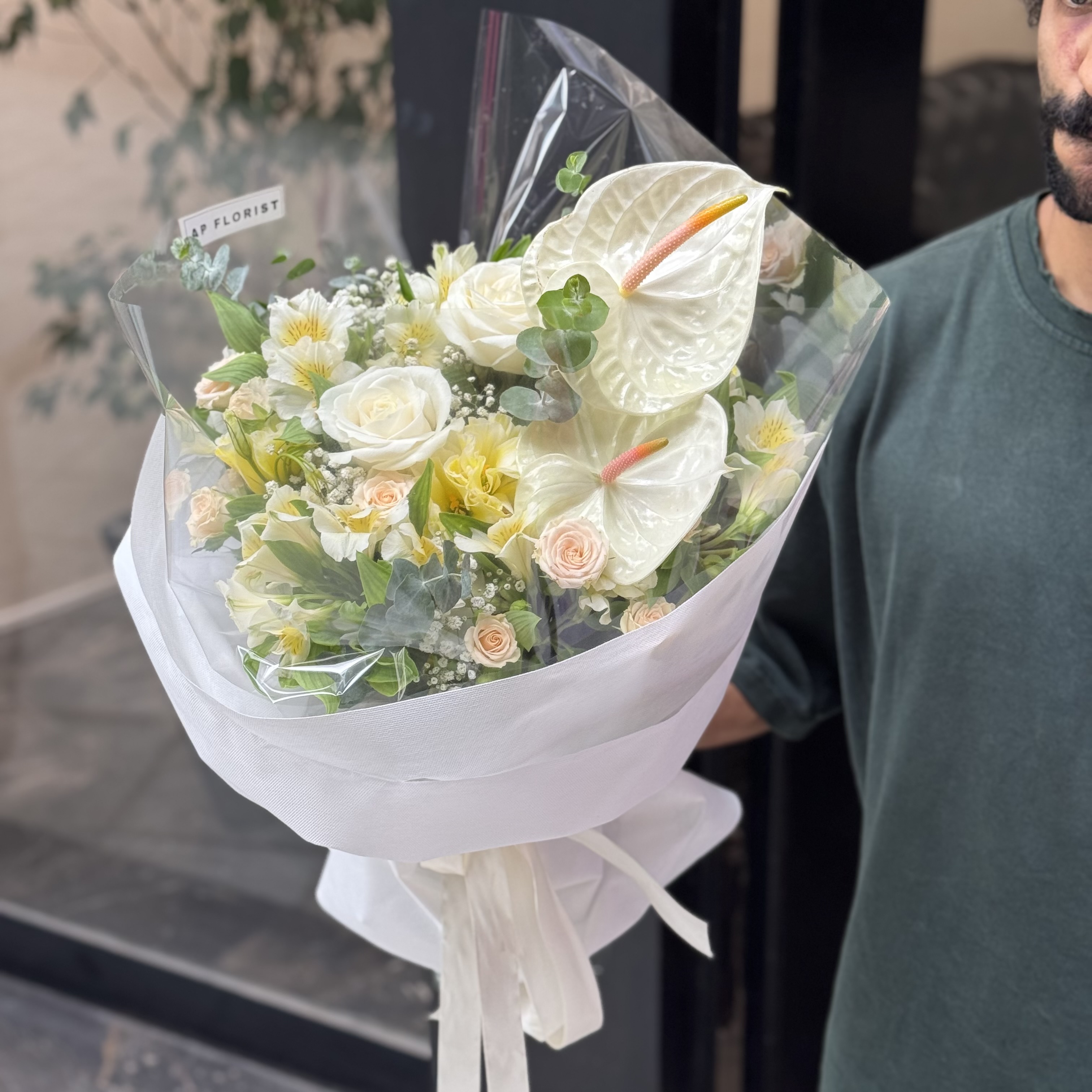 دستـهگل دالـیا ؛ ترکــیبی از گلهای رز هلندی، آنتریوم، رز مینیاتوری، آلستر، لیسین و برگ اکالیپتوس که در قالب دستهگل ایستـاده و بدون نیاز به گلدان آب ارائه میشود.برای موندگاری بیشتر گلها کافیه ؛ ۱- در فضای خنک نگهداری شود. ۲- اب گلها روزانه عوض شود. ۳- ساقهی گلها روزانه کوتاه شود.
