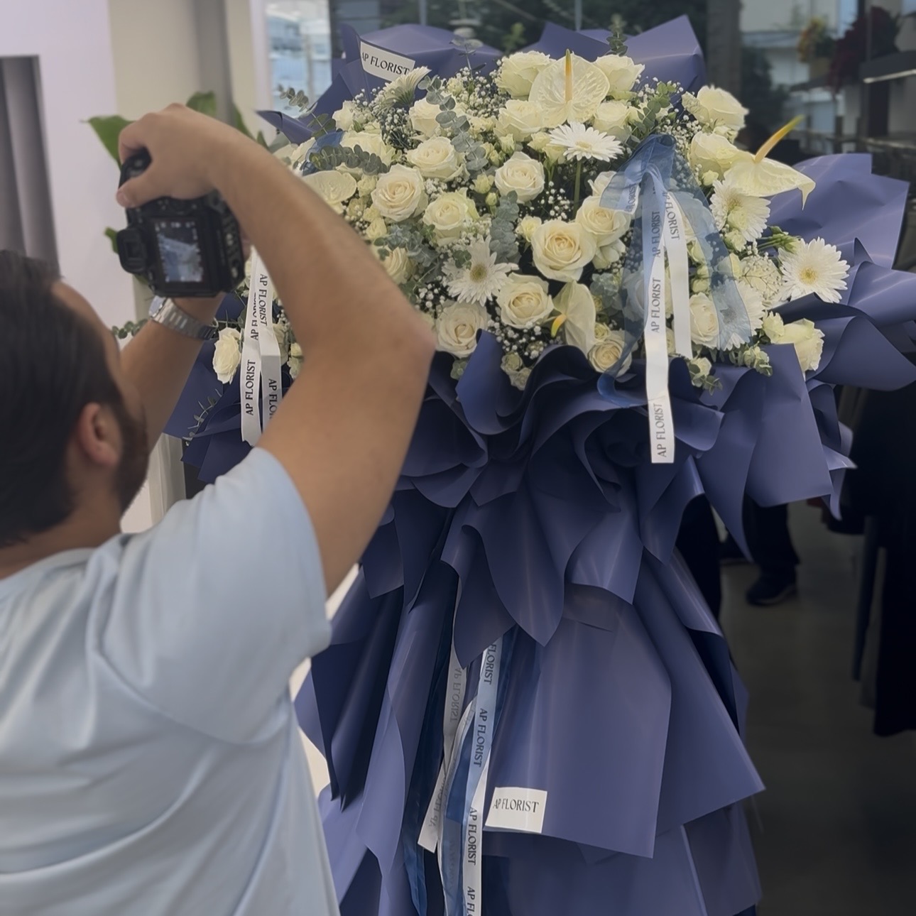 دستـهگل خیـال ؛ دستـهگُلی لوکـس و با اصالـت با ترکیبی از گلـهای “ رز هلندی ، آنتریوم ، ژربرا ، رز مینیاتوری و برگ اکالیپتوس “ و در ارتفاع ۲.۴۰ کـه رنگبندی دلخواهتون قابل ثبت و سفارشه…