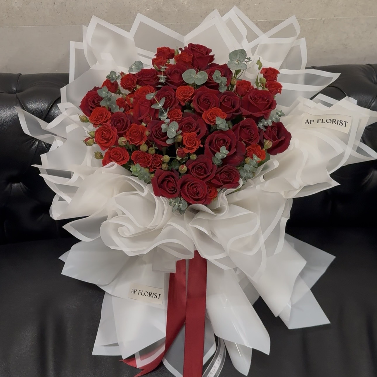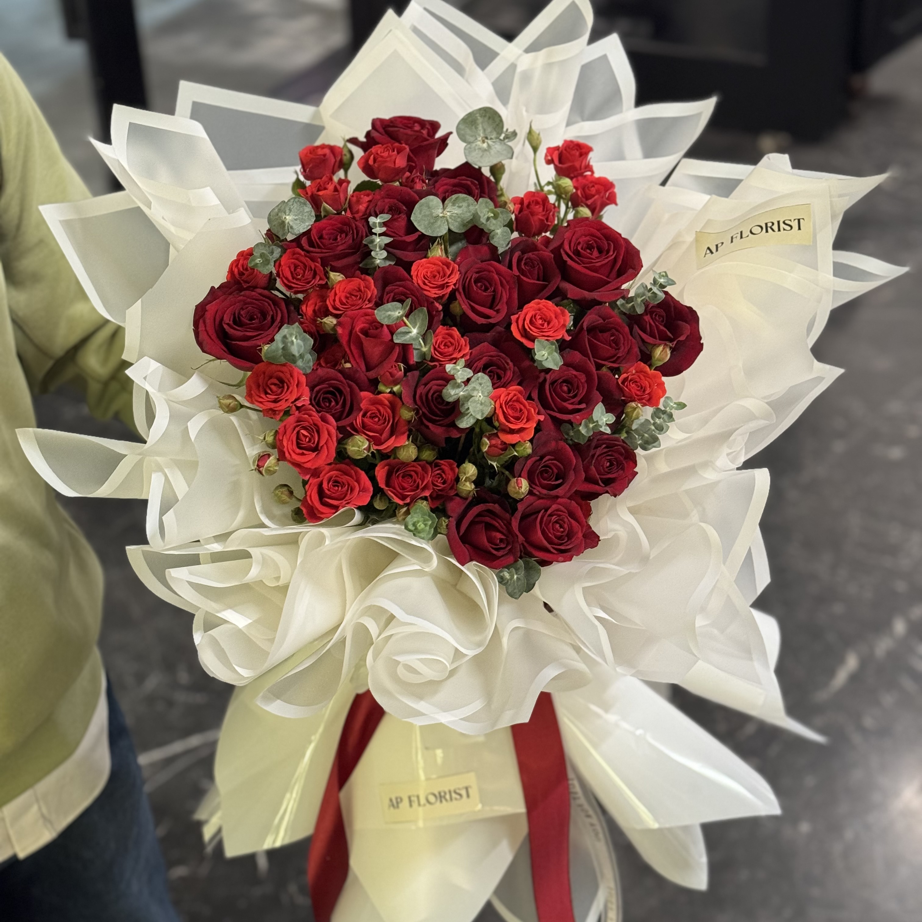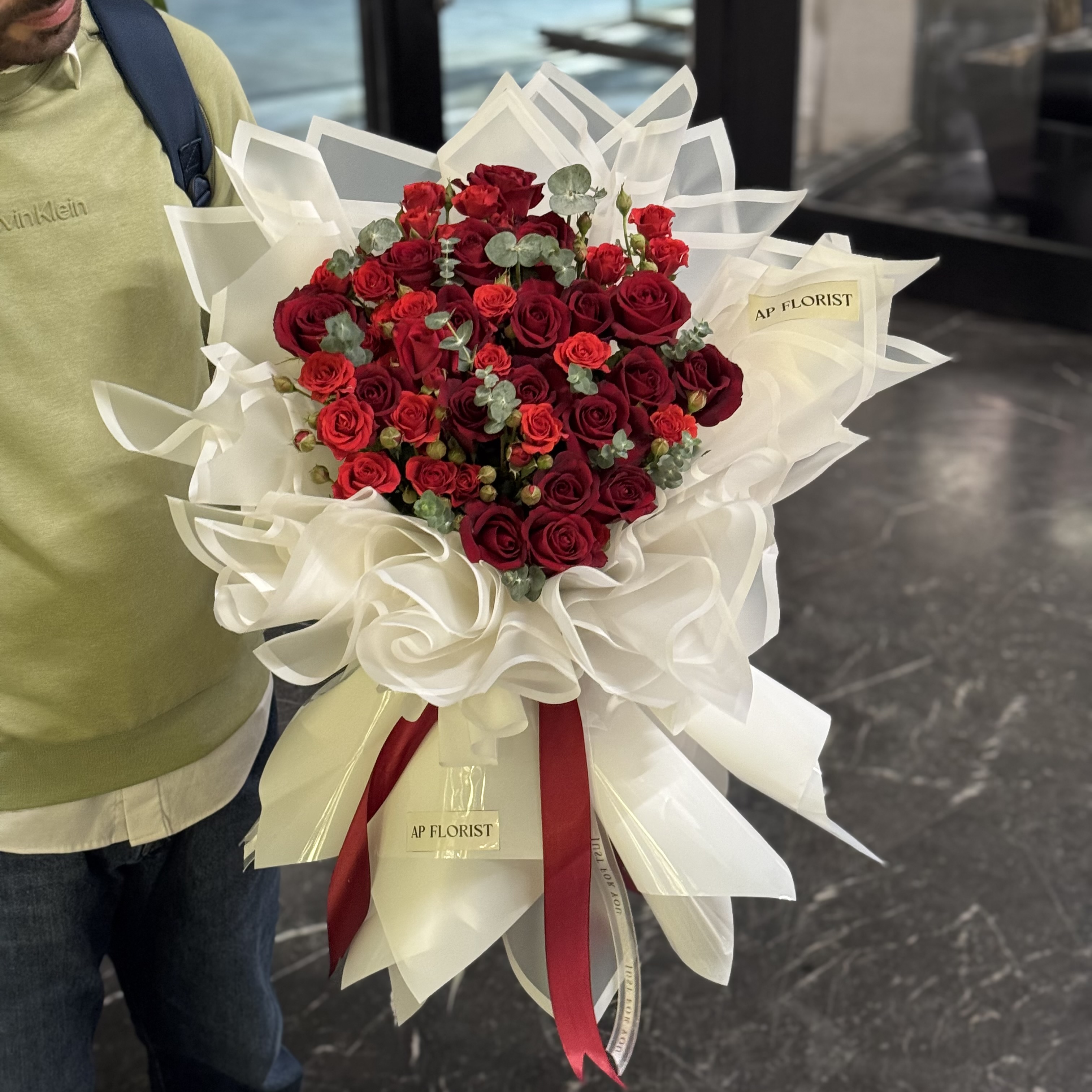 دستـهگل ناریـنا ؛ ترکـیبی از بیست شاخه رز هلندی قرمز و رز مینیاتوری که در قالب دستهگلهای ایستاده گالری موجود میباشد. قابل سفارش در رنگ و سایز دلخواهتون. برای موندگاری بیشتر گلها کافیه ؛ ۱- در فضای خنک نگهداری شود ۲- روزانه سـه لیوان آب در اسفنج بریزید.