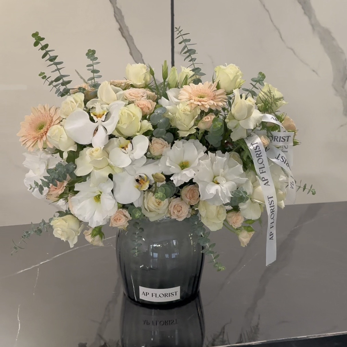 جار گل وردان ؛ ترکیبی شیک و از گلهای ارکیدهی سفید، رز هلندی، مینیاتوری و لیسینتوس که با شیشـهی بلوری مشکی دیزاین شده. رنگ گلهـا طبق سلیقهی شما قابل تغییره.