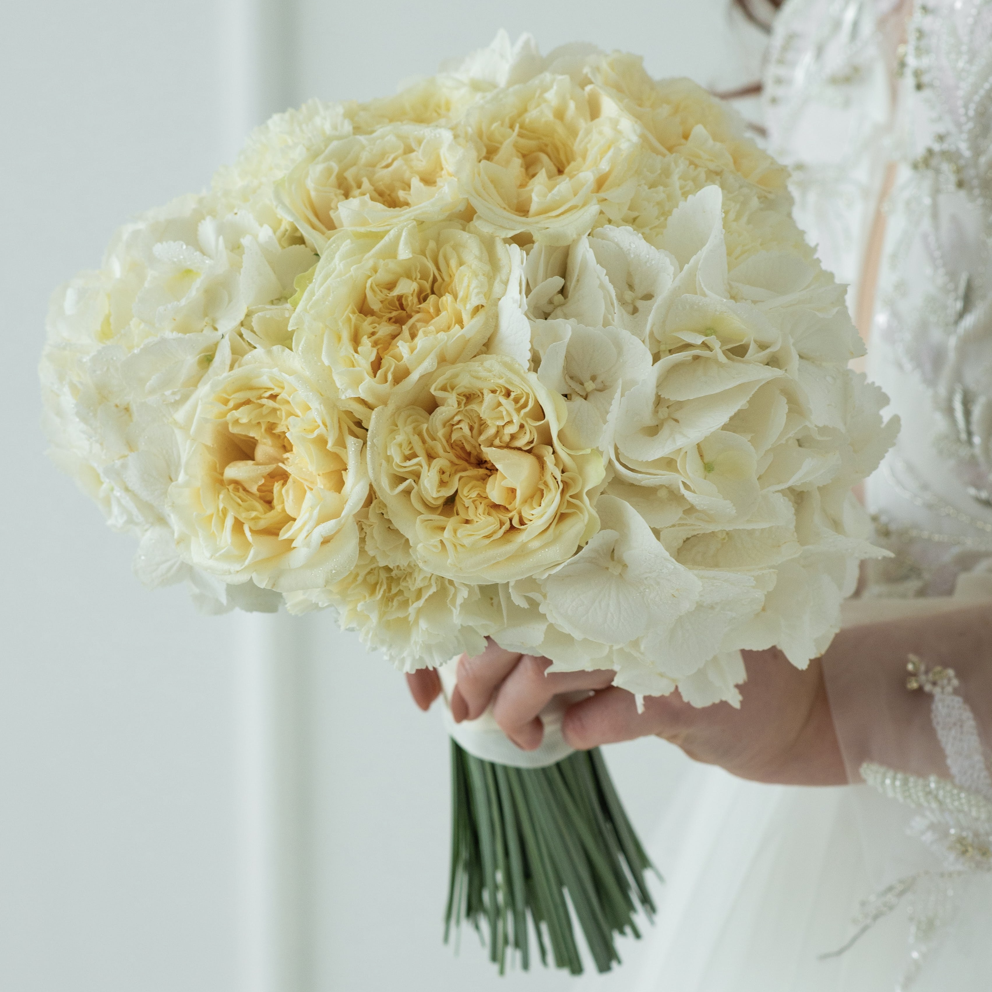 دستـهگل عروس آستورا ؛ ترکیبی لوکس و برند از گلهای ژولیت و هورتانسیا که از بهترین گلهای فصلــه. انتخابی شیک و ساده.